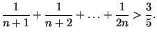 Индукция по n. База: 1/4 + 1/5 + 1/6 = 37/60 > 3/5. Шаг индукции делается как в задаче 160304.