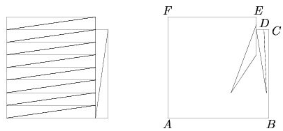 Оценка. Примем за единицу площадь одной клетки. Данная фигура представляет собой невыпуклый шестиугольник ABCDEF площади 63 с углом 270° в вершине D (рис. справа). Если фигура разбита на треугольники, то, очевидно, точка D должна принадлежать по крайней мере двум треугольникам, причём у одного из них сторона лежит на прямой DE, а у другого – на DC. Более того, по крайней мере для одного из них она лежит на соответствующем отрезке. Для определенности предположим, что это треугольник DKL, где K лежит на отрезке DC. Тогда основание DK этого треугольника не больше