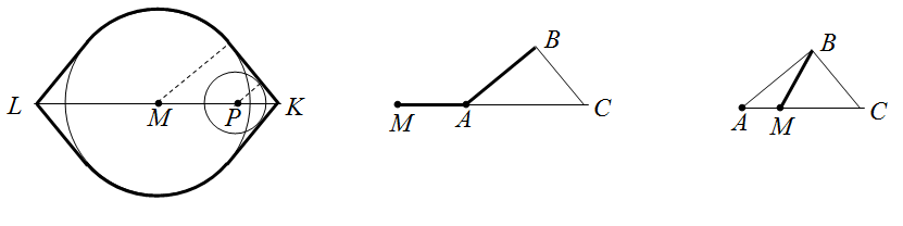 Посмотрим, куда путник сможет дойти за час, выйдя из точки M (Морозки). Если он пойдёт по полю, то через час окажется в пределах круга радиуса 3 (км) с центром M. Если он пойдёт по дороге, то окажется в какой-то точке отрезка KL длины 8 с серединой в M (мы считаем, что дорога горизонтальна). Докажем, что за час он не сможет выйти за пределы фигуры F, ограниченной указанной окружностью и касательными, проведёнными к ней из точек K и L (рис. слева). Действительно, если он дойдёт по дороге до точки P, затратив время 1 – t, а потом свернёт в поле, то через час окажется в пределах круга радиуса 3t с центром в точке P. Так как PK = 4t, то в силу подобия этот круг касается границы фигуры F. Это значит, что он будет находиться внутри (или на границе) F. С другой стороны, ясно, что за час можно попасть в любую точку границы F, подобрав подходящую точку поворота P.