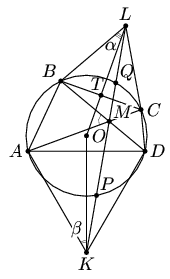 Диагонали вписанного четырёхугольника ABCD пересекаются в точке M, ∠AMB = 60°. На сторонах AD и BC во внешнюю сторону построены равносторонние треугольники ADK и BCL. Прямая KL пересекает описанную около ABCD окружность в точках P и Q. Докажите, что PK = LQ.