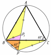 Первый способ. Отложим на луче AP отрезок AP1, равный отрезку CP. Тогда треугольники AP1B и CPB равны по двум сторонам и углу между ними. В треугольнике BPP1 BP1 = BP, ∠BPP1 = ∠BPA = ∠BCA = 60°. Поэтому PP1 = BP. Следовательно, AP = AP1 + P1P = BP + CP.