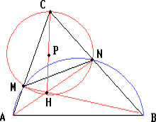 AN и BM — также высоты треугольника ABC. Пусть H — их точка пересечения. Точки M, C, N, H лежат на окружности с диаметром CH. Пусть P — её центр.