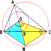 Продолжение биссектрисыADтреугольникаABCпересекает описанную окружность в точкеM. ПустьQ- центр окружности, вписанной в треугольникABC. Докажите, что треугольникиMBQиMCQ- равнобедренные.