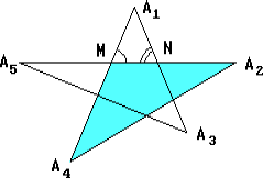 Обозначим вершины звезды последовательно: A1, A2, A3, A4, A5. Пусть M – точка пересечения отрезков A1A4 и A2A5, а N – отрезков A1A3 и A2A5. Тогда угол A1MN – внешний угол треугольника MA2A4, а угол A1NM – треугольника NA3A5. Поэтому ∠A1MN = ∠A2 + ∠A4, ∠A1NM = ∠A3 + ∠A5. Следовательно,