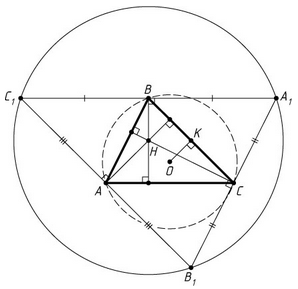 CH || BA1. Значит, BHCA1 – параллелограмм. Его диагонали делятся точкой пересечения K пополам. При этом OK ⊥ BC. Отрезок OK – средняя линия треугольника AHA1, следовательно, OK = AH/2. Шестой способ. Пусть L и F – середины отрезков AC и CH соответственно. Тогда OK ⊥ BC и AH ⊥ BC, поэтому OK || AH. С другой стороны, LF – средняя линия треугольника AHC, поэтому LF || AH и LF = AH/2. Следовательно, LF || OK. Отрезок KF – средняя линия треугольника BHC, поэтому KF || BH, а так как BH ⊥ AC, то KF ⊥ AC. С другой стороны, OL ⊥ AC, значит, OL || KF. Противоположные стороны четырёхугольника OKFL попарно параллельны, значит, это параллелограмм. Следовательно, OK = LF = AH/2.