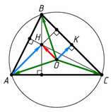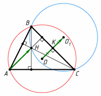 Для прямоугольного треугольника утверждение очевидно. Рассмотрим случай не прямоугольного треугольника. Пусть H – точка пересечения высот треугольника ABC, O – центр его описанной окружности, K – середина BC. Первый способ. Проведём через вершины данного треугольника ABC прямые, параллельные противоположным сторонам. Получим новый треугольник, подобный данному с коэффициентом 2 (стороны треугольника ABC являются средними линиями нового треугольника). При этом высоты треугольника ABC лежат на серединных перпендикулярах нового треугольника (рис. слева).