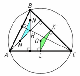 AH, BH и BC соответственно (рис. слева). Тогда MN = KL и MN || KL (средние линии треугольников ABH и ABC), MH || OK, NH || OL.