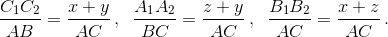 Пусть O – произвольная точка, взятая внутри треугольника ABC; A1A2 || BC, B1B2 || AC, C1C2 || AB (см. рис.). Обозначим A2C = OB2 = x, A2C1 = y,
