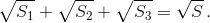 Через некоторую точку, взятую внутри треугольника, проведены три прямые, параллельные сторонам. Эти прямые разбивают треугольник на шесть частей, три из которых – треугольники с площадями S1, S2, S3. Найдите площадь S данного треугольника.