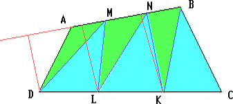 Проведём диагонали DM, LN и KB четырёхугольников AMLD, MNKL и NBCK. Пусть h1, h и h2 – расстояния от точек соответственно D, L и K до прямой AB. Тогда h = ½ (h1 + h2) (h – длина средней линии трапеции с основаниями длины h1 и h2).