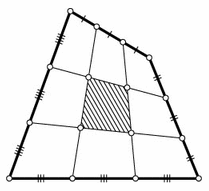Разделим каждую сторону выпуклого четырёхугольника ABCD на три равные части и соединим отрезками соответствующие точки на противоположных сторонах (см. рис.). Докажите, что площадь "среднего" четырёхугольника в 9 раз меньше площади четырёхугольника ABCD.