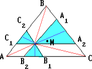 $\displaystyle \overrightarrow{MC_{1}}$ + $\displaystyle \overrightarrow{MB_{2}}$ = $\displaystyle \overrightarrow{MA}$, $\displaystyle \overrightarrow{MC_{2}}$ + $\displaystyle \overrightarrow{MA_{1}}$ = $\displaystyle \overrightarrow{MB}$, $\displaystyle \overrightarrow{MA_{2}}$ + $\displaystyle \overrightarrow{MB_{1}}$ = $\displaystyle \overrightarrow{MC}$.