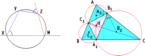 AB1C1, A1BC1 и A1B1C. Точки A2, B2 и C2 лежат на окружности девяти точек треугольника ABC, т.к. AH, BH и CH — диаметры описанных окружностей треугольников AB1C1, A1BC1 и