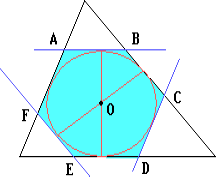 Пусть AB, CD и EF — стороны рассматриваемого шестиугольника ABCDEF, лежащие на указанных касательных. При симметрии относительно центра вписанной окружности данного треугольника прямая AB переходит в прямую DE, а прямая BC — в прямую EF. Поэтому точка B пересечения прямых AB и BC переходит в точку E пересечения прямых DE и EF.