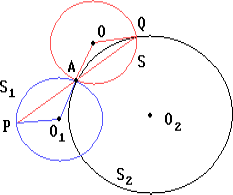 Отсюда вытекает следующий способ построения. Строим окружность S, симметричную данной окружности S1 относительно данной точки A. Точка пересечения окружностей S и S2, отличная от A, лежит на искомой прямой.