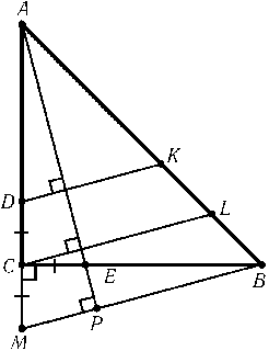 На продолжении отрезка AC за точку C возьмём точку M так, что CM = CE (см. рис.). Тогда треугольник ACE при повороте с центром C на 90° переходит в треугольник BCM. Поэтому прямая MB перпендикулярна прямой AE, а значит, параллельна прямой CL. Так как MC = CE = DC и прямые DK, CL и MB параллельны, то KL = LB.
