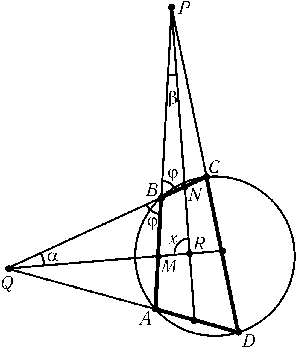 Обозначим точки пересечения и углы так, как показано на рис. Достаточно проверить, что x= 90o. Углы четырехугольника BMRNравны 180o-$\varphi$,$\alpha$+$\varphi$,$\beta$+$\varphi$и x, поэтому равенство x= 90oэквивалентно равенству (2$\alpha$+$\varphi$) + (2$\beta$+$\varphi$) = 180o. Остается заметить, что 2$\alpha$+$\varphi$=$\angle$BADи 2$\beta$+$\varphi$=$\angle$BCD.