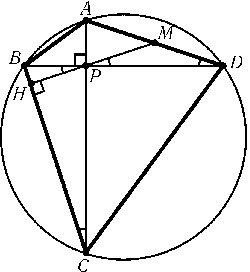 Пусть перпендикуляр, опущенный из точки Pна BC, пересекает BCв точке Hи ADв точке M(рис.).$\angle$BDA=$\angle$BCA=$\angle$BPH=$\angle$MPD. Из равенства углов MDPи MPDследует, что MP — медиана прямоугольного треугольника APD. В самом деле,$\angle$APM= 90o-$\angle$MPD= 90o-$\angle$MDP=$\angle$PAM, т. е. AM=PM=MD.