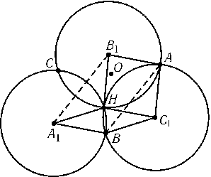 Пусть A1,B1и C1 — центры данных окружностей (рис.). Тогда A1BC1H — ромб, а значит, BA1||HC1. Аналогично B1A||HC1, поэтому B1A||BA1и B1ABA1 — параллелограмм. а) Так как A1B1$\perp$CHи A1B1||AB, то AB$\perp$CH. Аналогично доказывается, что BC$\perp$AHи CA$\perp$BH. б) Так же, как было доказано, что B1A||BA1, можно доказать, что B1C||BC1и A1C||AC1; кроме того, длины всех этих шести отрезков равны R. Достроим треугольник BA1Cдо ромба BA1CO. Тогда AB1COтоже ромб. Поэтому AO=BO=CO=R, т. e. O — центр описанной окружности треугольника ABC, и ее радиус равен R.