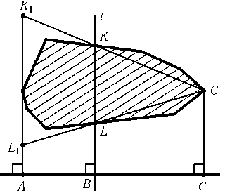 Обозначим проекцию прямой l через B, крайние точки проекции многоугольника – через A и C. Пусть C1 – точка многоугольника, проецирующаяся в точку C; прямая l пересекает многоугольник в точках K и L, а K1 и L1 – точки прямых C1K и C1L, проецирующиеся в точку A (см. рисунок).