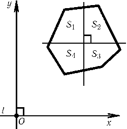 Обозначим площадь многоугольника через S. Пусть l – произвольная прямая. Введём систему координат, для которой прямая l является осью Ox. Пусть S(a) – площадь той части многоугольника, которая лежит ниже прямой y = a. При изменении a от – ∞ до + ∞ S(a) непрерывно меняется от 0 до S, поэтому S(a) = S/2 для некоторого a, то есть прямая y = a делит площадь многоугольника пополам. Аналогично существует прямая, перпендикулярная l и делящая площадь многоугольника пополам. Эти две прямые разбивают многоугольник на части, площади которых равны S1, S2, S3 и S4 (см. рис.). Так как S1 + S2 = S3 + S4 и S1 + S4 = S2 + S3, то S1 = S3 = A и S2 = S4 = B. При повороте прямой l на 90° A заменится на B, а B – на A. Так как A и B изменяются при повороте l непрерывно, то A = B для некоторого положения прямой l. При этом площади всех четырёх фигур равны.