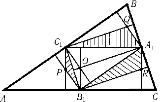Пусть A1,B1и C1 — середины сторон BC,CAи ABтреугольника ABC. Проведенные отрезки являются высотами треугольников AB1C1,A1BC1и A1B1C. Пусть P,Qи R — точки пересечения высот этих треугольников, а O — точка пересечения высот треугольника A1B1C1(рис.). Рассматриваемый шестиугольник состоит из треугольника A1B1C1и треугольников B1C1P,C1A1Qи A1B1R. Ясно, что$\triangle$B1C1P=$\triangle$C1B1O,$\triangle$C1A1Q=$\triangle$A1C1Oи $\triangle$A1B1R=$\triangle$B1A1O. Поэтому площадь рассматриваемого шестиугольника равна удвоенной площади треугольника A1B1C1. Остается заметить, что SABC= 4SA1B1C1.