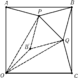 а) Разрежем исходный квадрат на четыре квадрата и рассмотрим один из них (рис.). Пусть точка B'симметрична точке Bотносительно прямой PQ. Докажем, что $\triangle$APB=$\triangle$OB'P. Треугольник APBравнобедренный, причем угол при его основании равен 15o, поэтому треугольник BPQравносторонний. Следовательно,$\angle$OPB'=$\angle$OPQ-$\angle$B'PQ= 75o- 60o= 15oи$\angle$POB'=$\angle$POQ/2 = 15o. Кроме того, AB=OP. Аналогично доказывается, что $\triangle$BQC=$\triangle$OB'Q. Следовательно, площадь заштрихованной на рис. части равна площади треугольника OPQ. б) Пусть площадь правильного двенадцатиугольника, вписанного в окружность радиуса 1, равна 12x. Согласно задаче а) площадь квадрата, описанного около этой окружности, равна 12x+ 4x= 16x; с другой стороны, площадь этого квадрата равна 4, поэтому x= 1/4 и 12x= 3.