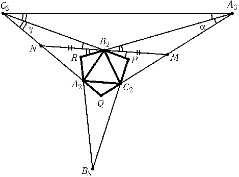 Пусть в исходном треугольнике ∠A = 3α, ∠B = 3β и ∠C = 3γ. Возьмём равносторонний треугольник A2B2C2 и построим на его сторонах как на основаниях равнобедренные треугольники A2B2R, B2C2P и C2A2Q с углами при основаниях 60° – γ, 60° – α, 60° – β соответственно (см. рис.). Продолжим боковые стороны этих треугольников за точки A2, B2 и C2 и обозначим точку пересечения продолжений сторон RB2 и QC2 через A3, PC2 и RA2 – через B3, QA2 и PB2 – через C3. Проведём через B2 прямую, параллельную A2C2, и обозначим через M и N точки её пересечения с прямыми QA3 и QC3. Ясно, что B2 – середина отрезка NM.