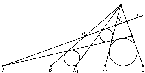 ПустьO — точка пересечения общих внешних касательных к вписанным окружностям треугольниковABK1иACK2(рис.). Проведем из точкиOкасательнуюlк вписанной окружности треугольника, образованного прямымиAK1,AK2и касательной к вписанным окружностям треугольниковABK1иACK2, отличной от прямойBC. Пусть прямаяlпересекает прямыеABиAK2в точкахB'иK2'. Согласно задаче6.12четырехугольникBK2K2'B'описанный. Это означает, что прямаяlкасается вписанной окружности треугольникаABK2. Аналогично доказывается, что прямаяlкасается вписанной окружности треугольникаACK1.