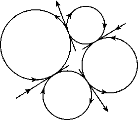На окружностях и касательных можно выбрать ориентации согласованным образом (рис.). ПустьAi — точка пересечения касательных к окружностиSi. Ориентации касательных задают ориентацию четырехугольникаA1A2A3A4(этот четырехугольник может быть невыпуклым). Из равенства длин касательных, проведенных из точкиAiк окружностиSi, следует, что