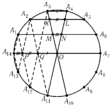 Докажите, что сумма длин отрезков, высекаемых углом AkOAk+1 на прямых A1A2k, A2A2k–1, ..., AkAk+1, равна R.