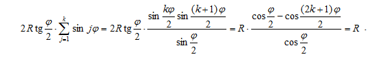 Указанные отрезки – основания равнобедренных треугольников с углом при вершине и высотами R sin φ, R sin 2φ, ..., R sin kφ. Их сумма (согласно задаче 61123) б) равна