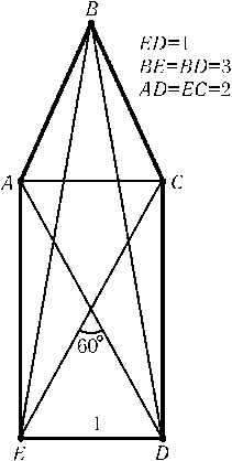Докажем, что n$\leq$5. Пусть AB= 1, а C — вершина, не соседняя ни с A, ни с B. Тогда |AC-BC| <AB= 1. Поэтому AC=BC, т. е. точка Cлежит на серединном перпендикуляре к стороне AB. Таким образом, кроме вершин A,B,Cмногоугольник может иметь еще лишь две вершины. Пример пятиугольника, обладающего требуемым свойством, приведен на рис. Поясним, как он устроен. ACDE — прямоугольник, AC=ED= 1 и $\angle$CAD= 60o. Точка Bзадается условием BE=BD= 3. Примером четырехугольника, обладающего требуемым свойством, является прямоугольник ACDEна том же рисунке.