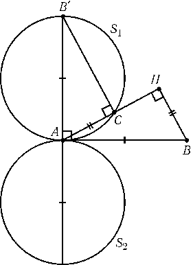 Пусть H — основание высоты hbтреугольника ABCи hb=b. Обозначим через B'точку пересечения перпендикуляра к прямой AB, проведенного через точку A, и перпендикуляра к прямой AH, проведенного через точку C. Прямоугольные треугольники AB'Cи BAHравны, так как $\angle$AB'C=$\angle$BAHи AC=BH. Поэтому AB'=AB, т. е. точка Cлежит на окружности с диаметром AB'. Пусть S1и S2 — образы окружности Sс диаметром ABпри поворотах на ±90oс центром A(рис.). Мы доказали, что точка C$\ne$Aпринадлежит объединению окружностей S1и S2. Обратно, пусть точка C$\ne$Aпринадлежит окружности S1или S2, AB' — диаметр соответствующей окружности. Тогда $\angle$AB'C=$\angle$HABи A'B=AB, поэтому AC=HB.