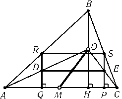 Пусть O — середина высоты BH, M — середина отрезка AC, Dи E — середины сторон RQи PSсоответственно (рис.). Точки Dи Eлежат на прямых AOи COсоответственно. Середина отрезка DEявляется центром прямоугольника PQRS. Ясно, что она лежит на отрезке OM. Искомым ГМТ является отрезок OM, за исключением его концов.