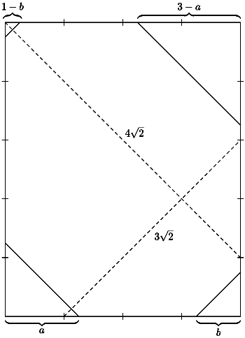 Для каждой из четырёх данных проекций многоугольника рассмотрим полосу, состоящую из точек, которые проецируются на данную проекцию. Каждая граница такой полосы пересекает все остальные полосы, поскольку иначе проекция многоугольника была бы меньше, чем нужно. Поэтому данный многоугольник лежит внутри фигуры, которая получается при отрезании от прямоугольника размером 4×5 треугольников со сторонамиa, 3 -a,bи 1 -b(рис.). Сумма площадей отрезанных треугольников равна