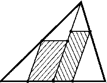 Рассмотрим сначала случай, когда две стороны параллелограмма лежат на прямых ABи AC, а четвертая вершина Xлежит на стороне BC. Если BX:CX=x: (1 -x), то отношение площади параллелограмма к площади треугольника равно 2x(1 -x)$\leq$1/2. В общем случае проведем параллельные прямые, содержащие пару сторон данного параллелограмма (рис.). Площадь данного параллелограмма не превосходит суммы площадей заштрихованных параллелограммов, а они относятся к разобранному выше случаю. Если прямые, содержащие пару сторон данного параллелограмма, пересекают лишь две стороны треугольника, то можно ограничиться одним заштрихованным параллелограммом.