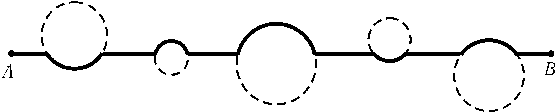 Будем тянуть провод по отрезку AB, огибая при этом встречающиеся деревья по кратчайшей дуге (рис.). Достаточно доказать, что путь по дуге окружности не более чем в 1,6 раза длиннее пути по прямой. Отношение длины дуги угловой величины 2$\varphi$к хорде, ее стягивающей, равно $\varphi$/sin$\varphi$. Так как 0 <$\varphi$$\leq$$\pi$/2, то $\varphi$/sin$\varphi$$\leq$$\pi$/2 < 1, 6.