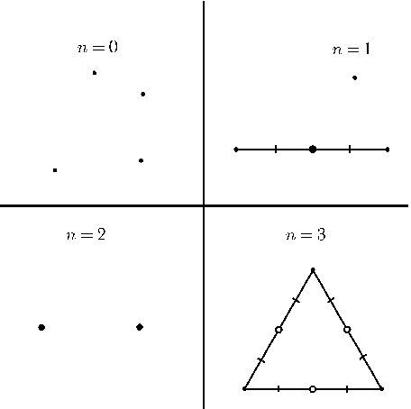 а) Предположим, что ограниченная фигура имеет два центра симметрии O1и O2. Введем систему координат с осью абсцисс, направленной по лучуO1O2. Так какSO2oSO1=T2$\scriptstyle \overrightarrow{O_1O_2}$, фигура переходит в себя при переносе на вектор2$\overrightarrow{O_1O_2}$. Ограниченная фигура не может обладать этим свойством, так как образ точки с наибольшей абсциссой не принадлежит фигуре. б) ПустьO3=SO2(O1). Легко проверить, чтоSO3=SO2oSO1oSO2. Поэтому если O1и O2 — центры симметрии фигуры, то и O3 — центр симметрии, причемO3$\ne$O1и O3$\ne$O2. в) Покажем, что конечное множество может иметь только 0, 1, 2 или 3 к почти центров симметриик. Соответствующие примеры приведены на рис. Остается доказать, что конечное множество не может иметь больше трех к почти центров симметриик. Почти центров симметрии конечное число, так как они являются серединами отрезков, соединяющих точки множества. Поэтому можно выбрать прямую, проекции почти центров симметрии на которую не сливаются. Следовательно, доказательство достаточно провести для точек, лежащих на одной прямой. Пусть на прямой задано nточек с координатамиx1<x2<...<xn - 1<xn. Если мы выбрасываем точку x1, то центром симметрии оставшегося множества может быть только точка(x2+xn)/2; если выбрасываем xn — то только точка(x1+xn - 1)/2; если же выбрасываем любую другую точку — то только точка(x1+xn)/2. Поэтому почти центров симметрии не больше трех.