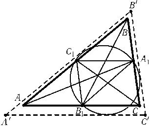 Пусть A1,B1и C1 — середины сторонBC,ACи ABсоответственно. При гомотетии с центром в точке пересечения медиан треугольника и коэффициентом гомотетии -1/2 описанная окружность SтреугольникаABCпереходит в описанную окружность S1треугольникаA1B1C1. Так как окружность S1пересекает все стороны треугольникаABC, то можно построить треугольникA'B'C'со сторонами, параллельными сторонам треугольникаABC, для которого S1будет вписанной окружностью (рис.). Пусть rи r' — радиусы вписанных окружностей треугольниковABCи A'B'C';Rи R1 — радиусы окружностей Sи S1. Ясно, чтоr$\le$r'=R1=R/2. Равенство достигается, если треугольникиA'B'C'и ABCсовпадают, т. е. S1 — вписанная окружность треугольникаABC. В этом случаеAB1=AC1, поэтомуAB=AC. АналогичноAB=BC.