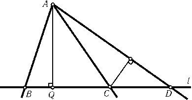 Предположим, что не все прямые проходят через одну точку. Рассмотрим точки пересечения прямых и выберем наименьшее ненулевое расстояние от этих точек до данных прямых. Пусть наименьшим будет расстояние от точки Aдо прямой l. Через точку Aпроходят по крайней мере три данные прямые. Пусть они пересекают прямую lв точках B,Cи D. Опустим из точки AперпендикулярAQна прямую l. Две из точек B,Cи Dлежат по одну сторону от точки Q, например Cи D. Пусть для определенностиCQ<DQ(рис.). Тогда расстояние от точки Cдо прямойADменьше, чем расстояние от точки Aдо прямой l, что противоречит выбору Aи l.