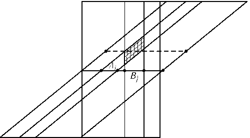 Пусть-1$\le$c$\le$1. Сдвинем данный отрезок наcвдоль себя, а затем сдвинем его наcв ортогональном направлении. Заштрихованная на рис. область соответствует пересечению отрезковAiиBj. Ее площадь равна произведению длин этих отрезков. Если рассмотреть все пары отрезков системAиB, то заштрихованная область будет иметь площадьp(1 -p). Поэтому некоторое горизонтальное сечение заштрихованных областей имеет длину не меньшеp(1 -p)/2.