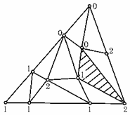 Вершины треугольника помечены цифрами 0, 1 и 2. Этот треугольник разбит на несколько треугольников таким образом, что никакая вершина одного треугольника не лежит на стороне другого. Вершинам исходного треугольника оставлены старые пометки, а дополнительные вершины получают номера 0, 1, 2, причём каждая вершина на стороне исходного треугольника должна быть помечена одной из пометок вершин этой стороны (см. рис.). Докажите, что существует треугольник разбиения, помеченный цифрами 0, 1, 2.