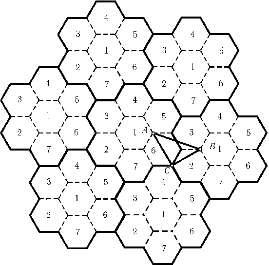 Приведем пример раскраски плоскости в семь цветов, для которой расстояние между любыми двумя одноцветными точками не равно 1. Разобьем плоскость на равные шестиугольники со стороной aи окрасим их, как показано на рис. (точки, принадлежащие двум или трем шестиугольникам, можно красить в любой из цветов этих шестиугольников). Наибольшее расстояние между точками одного цвета, лежащими в одном шестиугольнике, не превосходит 2a, а наименьшее расстояние между точками одного цвета, лежащими в разных шестиугольниках, не меньше длины отрезкаAB(см. рис.). Ясно, чтоAB2=AC2+BC2= 4a2+ 3a2= 7a2> (2a)2. Поэтому, если2a< 1 <$\sqrt{7}$a, т. е.1/$\sqrt{7}$<a< 1/2, то расстояние между точками одного цвета не может быть равно 1.