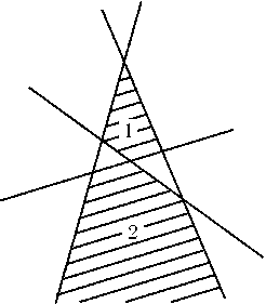 Назовем прямуюграничнойдля данной фигуры, если она является продолжением отрезка или луча, ограничивающего эту фигуру. Достаточно доказать, что две рассматриваемые фигуры не могут иметь более четырех общих граничных прямых. Если две фигуры имеют четыре общие граничные прямые, то одна из фигур лежит в области 1, а другая лежит в области 2 (рис.). Пятая граничная прямая фигуры, лежащей в области 1, должна пересекать две соседние стороны четырехугольника 1, но тогда она не может быть граничной прямой для фигуры, лежащей в области 2.