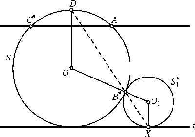 Пусть C — вершина данного угла. При инверсии с центром в точке AпрямаяCBперейдет в окружность S, а окружности S1и S2 — в окружность S1с центром O1, касающуюся Sв точке B, и прямую l, параллельнуюCA, касающуюся S1в точке X(рис.). Проведем в окружности SрадиусOD$\perp$CA. Точки O,Bи O1лежат на одной прямой, aOD|O1X. Поэтому$\angle$OBD= 90o-$\angle$DOB/2 = 90o- ($\angle$XO1B/2) =$\angle$O1BX, следовательно, точка Xлежит на прямойDB. Еще раз применив инверсию, получим, что искомое множество точек касания — это дугаABокружности, проходящей через точки A,Bи D.