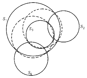 Даны четыре окружности, причем окружности S1и S3пересекаются с обеими окружностями S2и S4. Докажите, что если точки пересечения S1с S2и S3с S4лежат на одной окружности или прямой, то и точки пересечения S1с S4и S2с S3лежат на одной окружности или прямой (рис.).