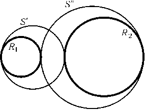 Пусть R1и R2 — какая-либо пара несоприкасающихся окружностей. Оставшиеся четыре окружности образуют цепочку, поэтому по предыдущей задаче окружности S'и S'', касающиеся R1и R2в точках их пересечения с линией центров, пересекаются под прямым углом (рис.). Если R2лежит внутри R1, то радиусы r'и r''окружностей S'и S''равны(r1+r2+d)/2 и (r1+r2-d)/2, а расстояние между их центрамиd'= 2r1-r1-r2=r1-r2. Угол между S'и S''равен углу между их радиусами, проведенными в точку пересечения, поэтому(d')2= (r')2+ (r'')2или, после преобразований,d2=r12+r22- 6r1r2. В случае, когда R1и R2не лежат одна внутри другой, радиусы окружностей S'и S''равны(d+ (r1-r2))/2 и (d- (r1-r2))/2, а расстояние между центрамиd'=r1+r2+d- (r1' +r2') =r1+r2. В результате получаемd2=r12+r22+ 6r1r2.