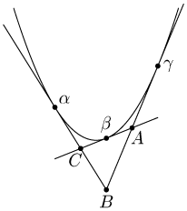 Касательные к параболе в точках$\alpha$,$\beta$,$\gamma$образуют треугольникABC(рис.). Докажите, что: а) описанная окружность треугольника ABC проходит через фокус параболы; б) высоты треугольника ABC пересекаются в точке, лежащей на директрисе параболы; в)$S_{\alpha\beta\gamma}=2S_{ABC}$; г)$\sqrt[3]{S_{\alpha\beta C}}+\sqrt[3]{S_{\beta\gamma A}}= \sqrt[3]{S_{\alpha\gamma B}}$.