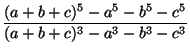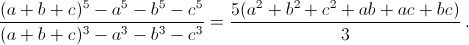 (a + b + c)3 – a3 – b3 – c3 = 3(a + b)(a + c)(b + c) (см задачу 161005 ж). Разложим на множители числитель. Первый способ. (a + b)5 – a5 – b5 = 5ab(a3 + b3) + 10a2b2(a + b) = 5ab(a + b)(a2 + ab + b2). Поэтому